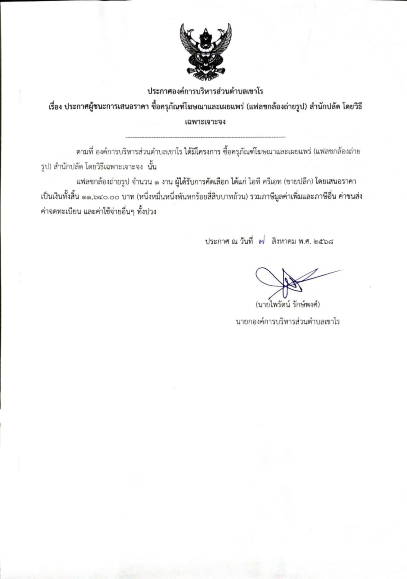 ประกาศองค์การบริหารส่วนตำบลเขาโร เรื่องประกาศผู้ชนะการเสนอราคา ซื้อครุภัณฑ์โฆษณาเเละเผยเเพร่ (เเฟลซกล้องถ่ายรูป)สำนักปลัด โดยวิธีเฉพาะเจาะจง 7 สิงหาคม 25689 สิงหาคม 2025อบต. เขาโรประกาศผู้ชนะการเสนอราคา Post Views: 19 FacebookFacebookXXLINELine