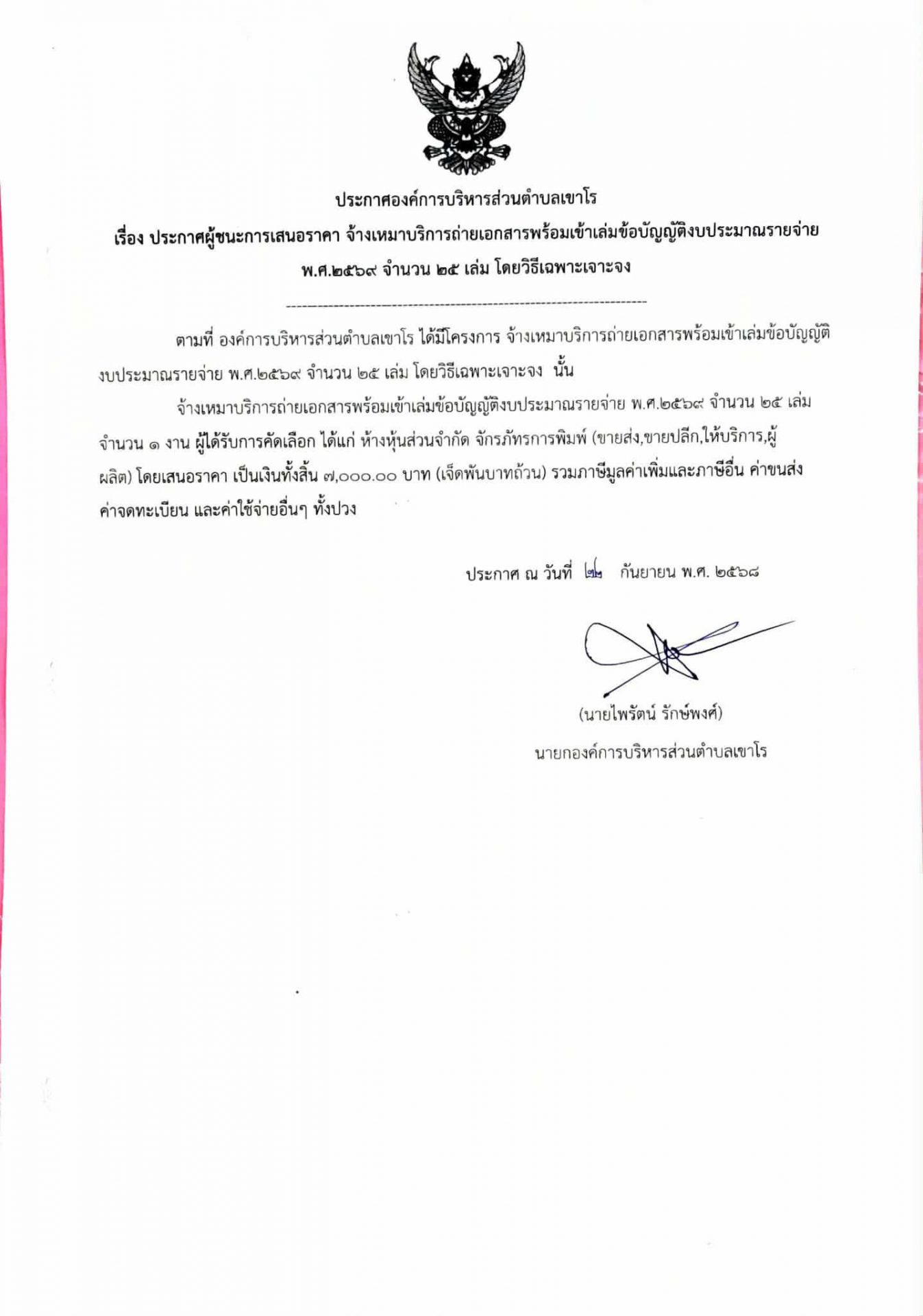 ประกาศองค์การบริหารส่วนตำบลเขาโร เรื่องประกาศผู้ชนะการเสนอราคา จ้างเหมาบริการถ่ายเอกสสารพร้อมเข้าเล่มข้ออบัญญัติงบประมาณรายจ่าย พ.ศ.2569 จำนวน 25 เล่ม โดยวิธีเฉพาะเจาะจง 22 กันยายน 256823 กันยายน 2025อบต. เขาโรประกาศผู้ชนะการเสนอราคา Post Views: 12 FacebookFacebookXXLINELine