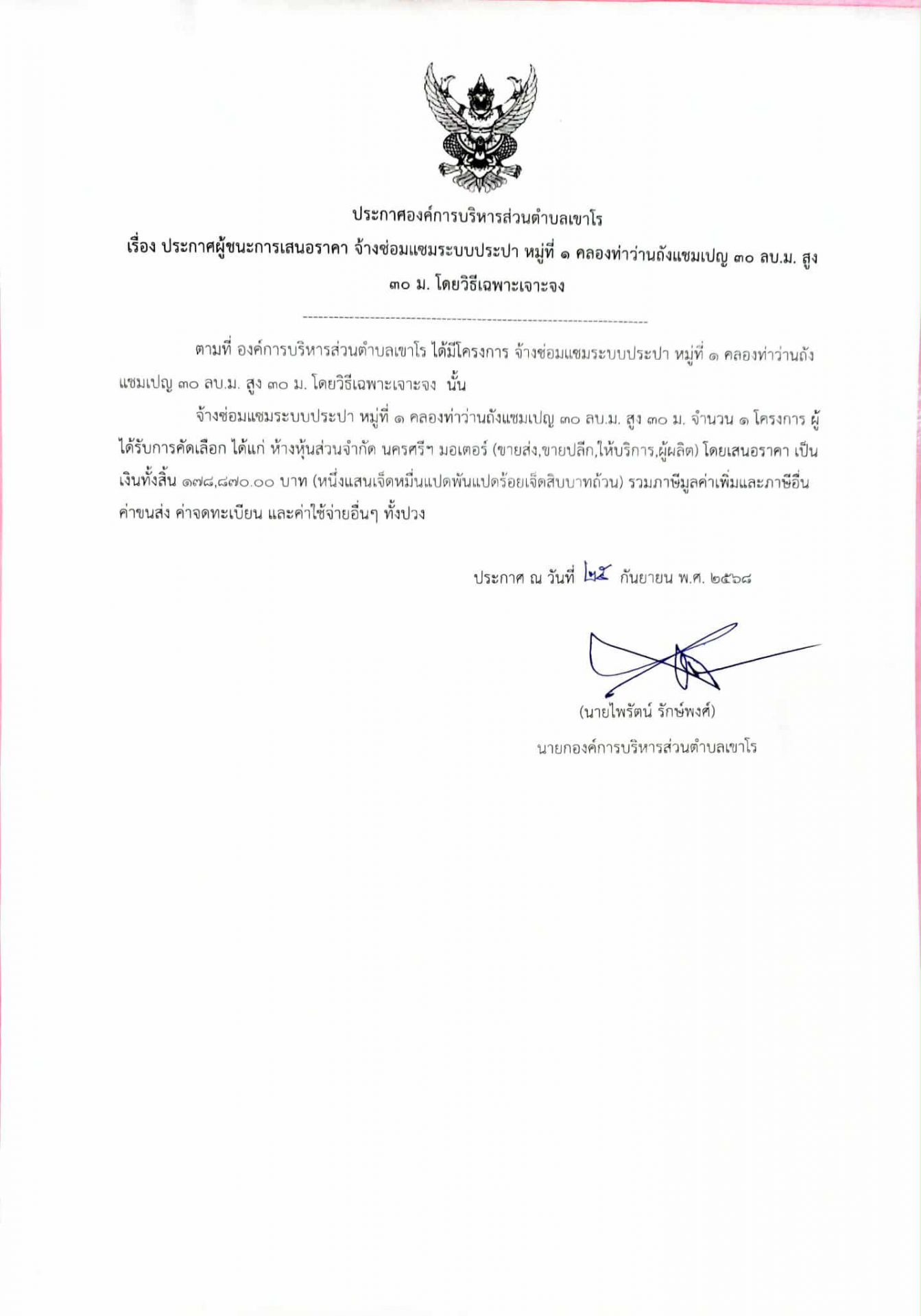 ประกาศองค์การบริหารส่วนตำบลเขาโร เรื่อง ประกาศผู้ชนะการเสนอราคา จ้างซ่อมเเซมระบบประปา ม.1 คลองท่าว่านถังเเชมเปญ 30 ลบ.ม. สูง 30 ม.โดยวิธีเฉพาะเจาะจง 25 กันยายน 2568อบต. เขาโรประกาศผู้ชนะการเสนอราคา Post Views: 15 FacebookFacebookXXLINELine