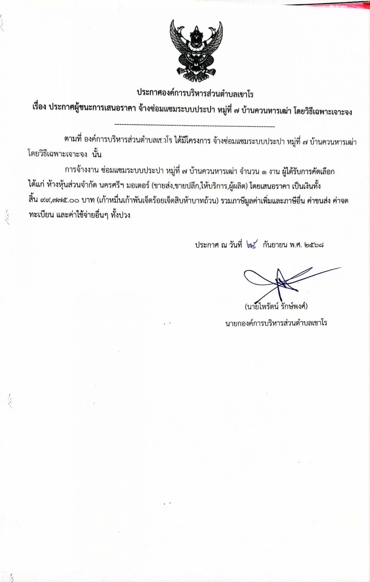ประกาศองค์การบริหารส่วนตำบลเขาโร เรื่องประกาศผู้ชนะการเสนอราคา จ้างซ่อมเเซมระบบประปา หมู่ที่ 7 บ้านควนหารเฒ่า โดยวิธีเฉพาะเจาะจง 25 กันยายน 256829 กันยายน 2025อบต. เขาโรประกาศผู้ชนะการเสนอราคา Post Views: 7 FacebookFacebookXXLINELine