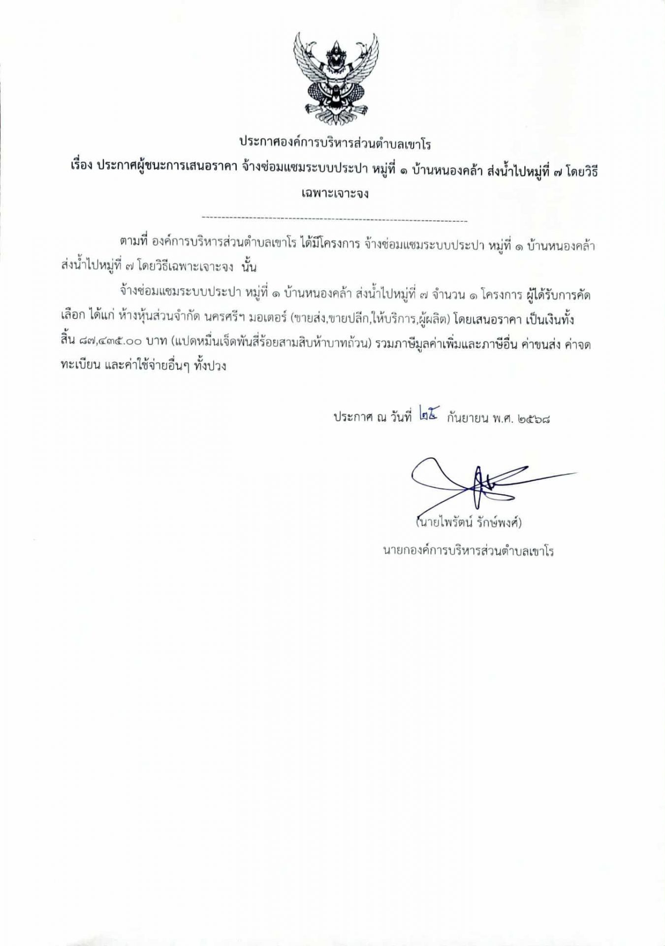 ประกาศองค์การบริหารส่วนตำบลเขาโร เรื่องประกาศผู้ชนะการเสนอราคา จ้างซ่อมเเซมระบบประปา หมู่ที่ 9 บ้านหนองคล้า ส่งน้ำไปหมู่ที่ 7 โดยวิธีเฉพาะเจาะจง 25 กันยายน 256829 กันยายน 2025อบต. เขาโรประกาศผู้ชนะการเสนอราคา Post Views: 8 FacebookFacebookXXLINELine