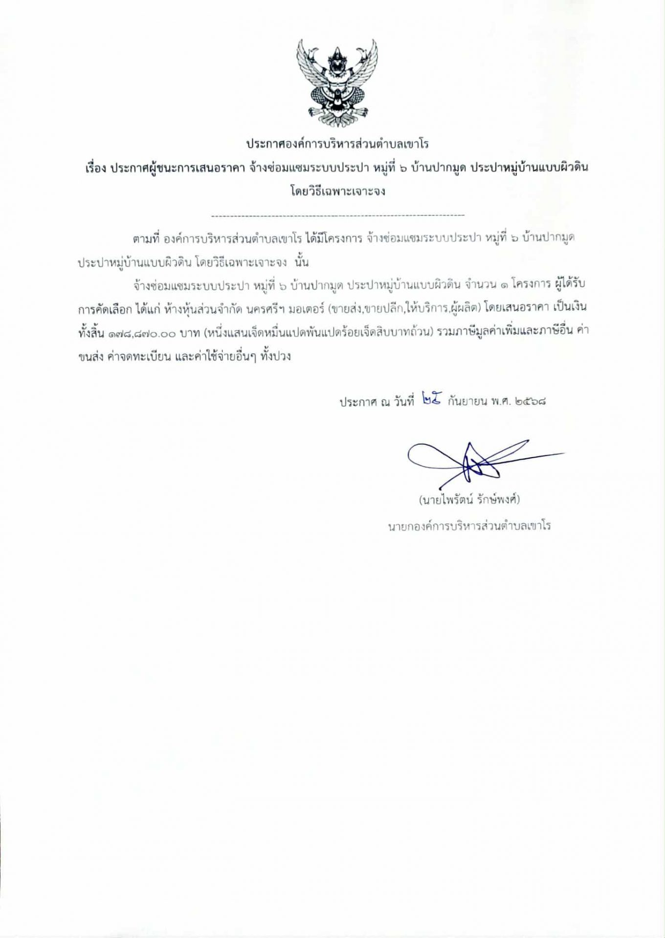 ประกาศองค์การบริหารส่วนตำบลเขาโร เรื่องประกาศผู้ชนะการเสนอราคา จ้างซ่อมเเซมระบบประปา หมู่ที่ 6 บ้านปากมูด ประปาหมู่บ้านเเบบผิวดิน โดยวิธีเฉพาะเจาะจง 25 กันยายน 256829 กันยายน 2025อบต. เขาโรประกาศผู้ชนะการเสนอราคา Post Views: 8 FacebookFacebookXXLINELine