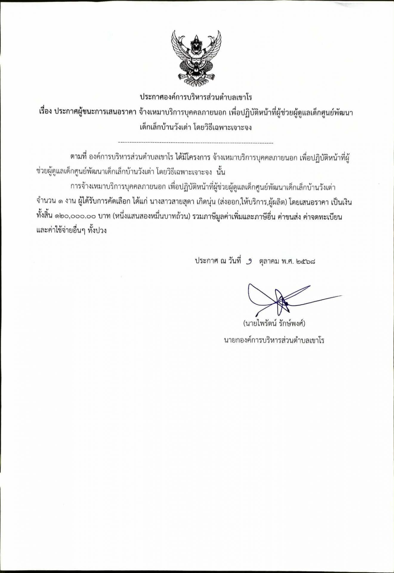ประกาศองค์การบริหารส่วนตำบลเขาโร เรื่องประกาศผู้ชนะการเสนอราคา จ้างเหมาบริการบุุคคลภายนอก เพื่อปฏิบัติหน้าที่ผู้ช่วยผู้ดูเเลเด็กศูนย์พัฒนาเด็กเล็กบ้านวังเต่า โดยวิธีเฉพาะเจะาจง