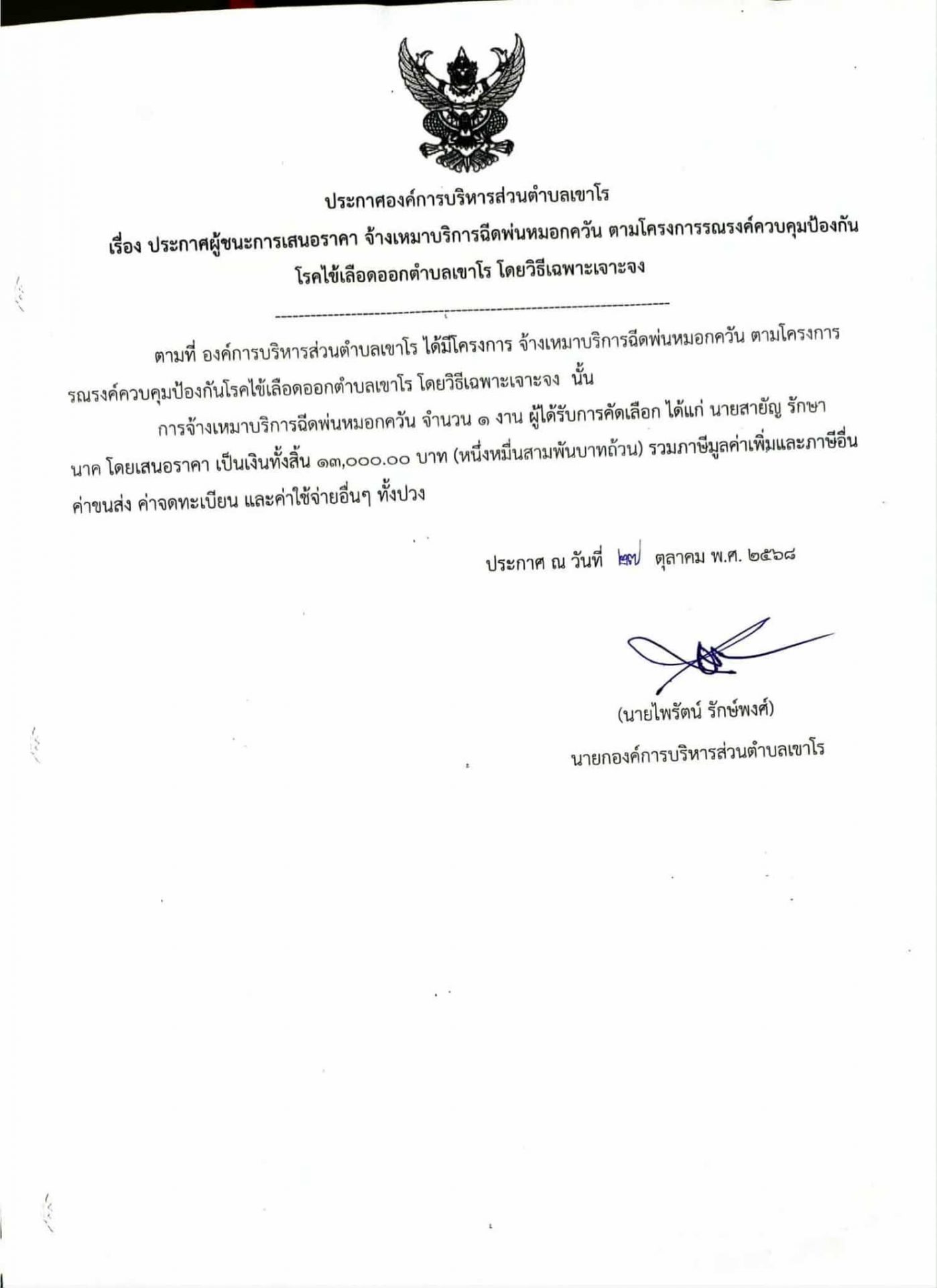 ประกาศองค์การบริหารส่วนตำบลเขาโร เรื่องประกาศผู้ชนะการเสนอราคา จ้างเหมาบริการฉีดพ่นหมอกควัน ตามโครงการรณรงค์ควบคุมป้องกันโรคไข้เลือดออกตำบลเขาโร โดยวิธีเฉพาะเจาะจง
