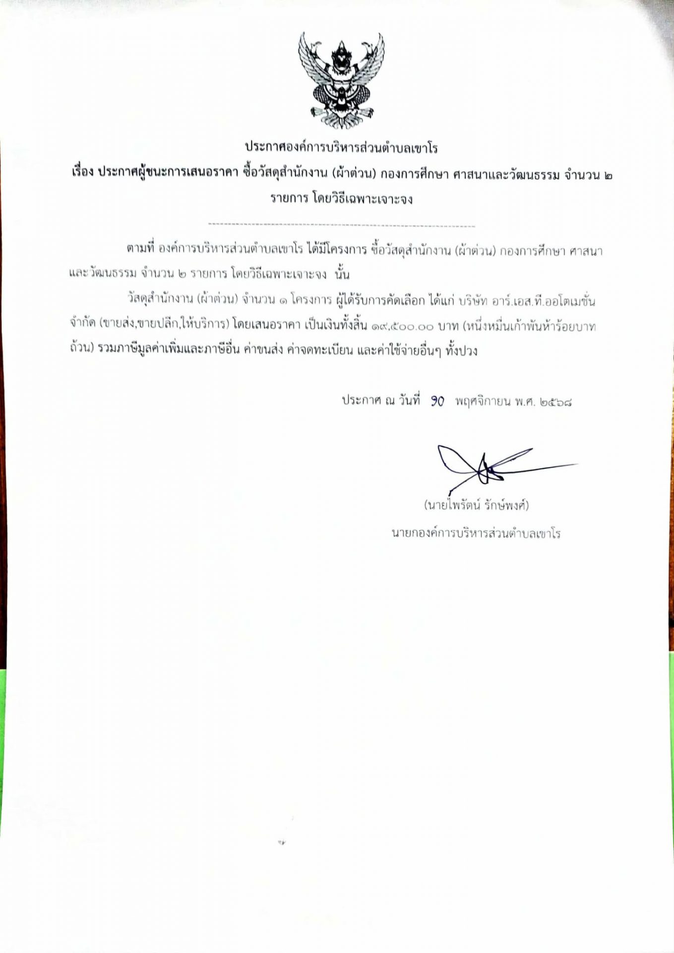 ประกาศองค์การบริหารส่วนตำบลเขาโร เรื่อง ประกาศผู้ชนะการเสนอราคา ซื้อวัสดุสำนักงาน (ผ้าต่วน) กองการศึกษา ศาสนาเเละวัฒนธรรม จำนวน 2 รายการ โดยวิธีเฉพาะเจาะจง