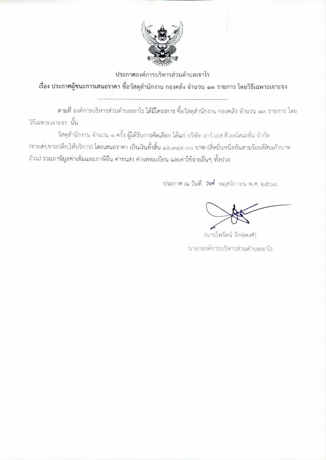 ประกาศองค์การบริหารส่วนตำบลเขาโร เรื่องประกาศผู้ชนะการเสนอราคา ซื้อวัสดุสำนักงาน กองคลัง จำนวน 13 รายการ โดยวิธีเฉพาะเจาะจง 17 พฤศจิกายน 256818 พฤศจิกายน 2025อบต. เขาโรประกาศผู้ชนะการเสนอราคา Post Views: 2 FacebookFacebookXXLINELine